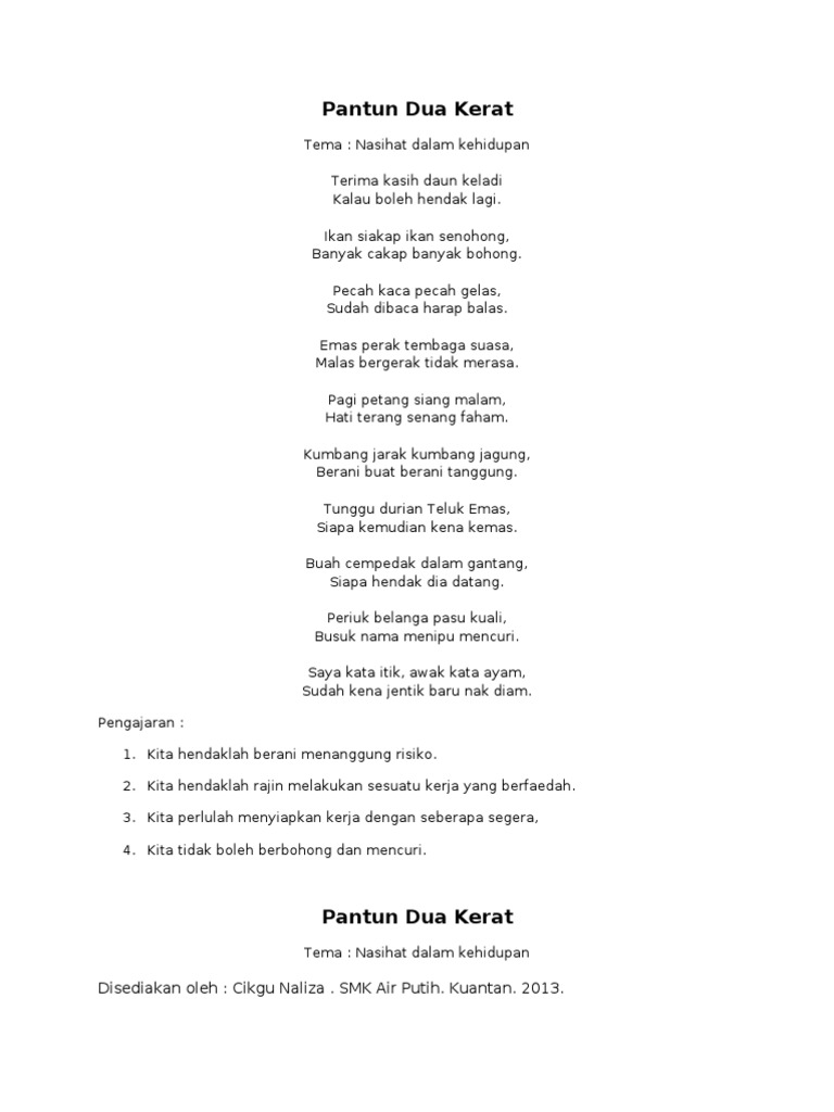 . Orang yang malas berusaha tidak akan dapat apa-apa. Seseorang yang banyak berkata-kata akan membuat banyak kesilapan. PANTUN DUA KERAT NASIHAT Maksud pantun Nasihat kepada manusia supaya sentiasa berwaspada dan bersedia dengan apa sahaja yang dilakukan.